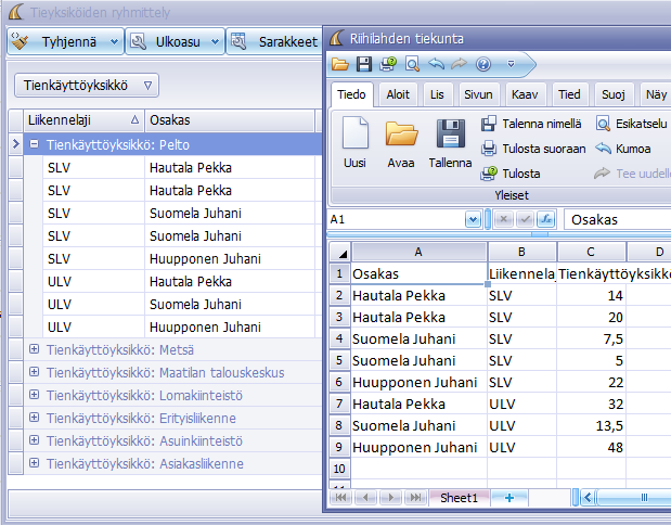 Ryhmittelyikkunassa yksiköintitietoja voidaan lajitella, suodattaa ja ryhmitellä halutulla tavalla. 2015 versiossa kaikki ikkunan tulostiedot voidaan siirtää taulukkolaskimeen.