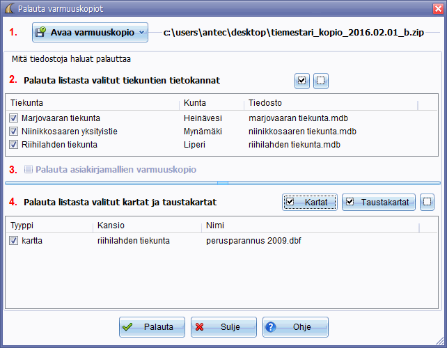 Tiemestarin varmuuskopiointi on uusittu. Varmuuskopio on nyt zip-pakkaus, jossa ovat sekä kopioitavat tiekunnat että kartat.