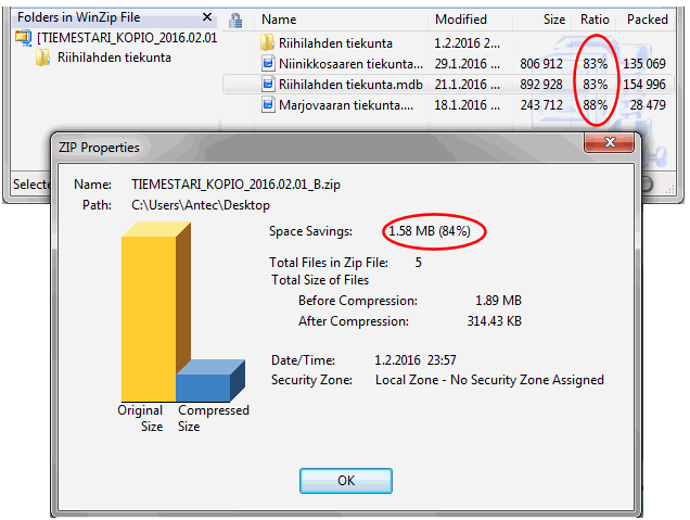 Tiekuntien tiedostot pakkautuvat hyvin, tavallisesti n. 1/5:aan alkuperäisestä koostaan. Näin levytilaa säästyy, kun tallennusvälineelle saadaan mahtumaan useampia varmuuskopioita.