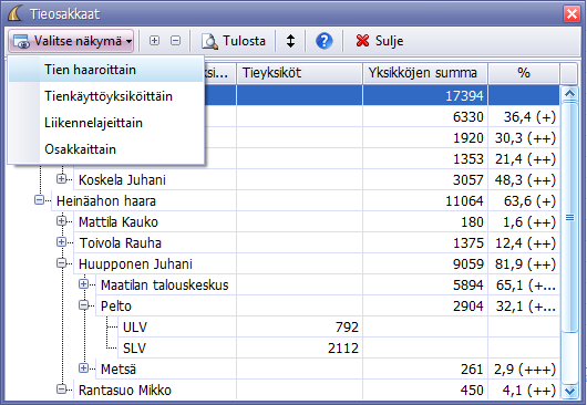 Tieyksiköt saadaan näkymään puu-muodossa, josta nähdään yksiköiden määrät ja niiden jakautuminen. Yksiköinti voidaan ryhmitellä neljällä eri tavalla, jolloin osakastiedoista saadaan erilaisia näkymiä.