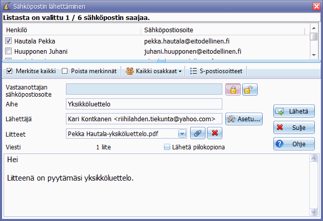 Sähköpostin lähettämistä on laajennettu niin, että tiemaksujen lisäksi ohjelmasta voidaan lähettää mitä tahansa liitteellisiä sähköpostiviestejä. Alla olevassa kuvassa liitteenä on osakkaan yksikköluettelo.