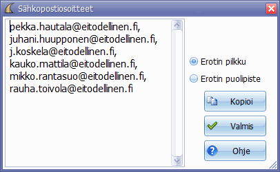 Jos sähköpostin lähettämiseen halutaan käyttää erillistä ohjelmaa, niin osakastietoihin tallennetut sähköpostiosoitteet voidaan viedä leikepöydän kautta siihen.