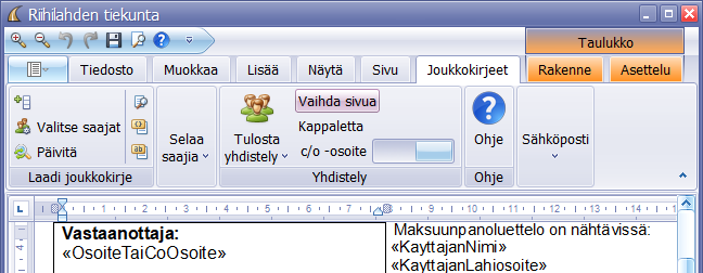 Joukkokirjeissä on uusi yhdistelykenttä c/o -osoitetta varten sekä suodatin, jonka avulla joukkokirjeiden saajiksi voidaan valita ne osakkaat, joilla ei ole sähköpostiosoitetta.