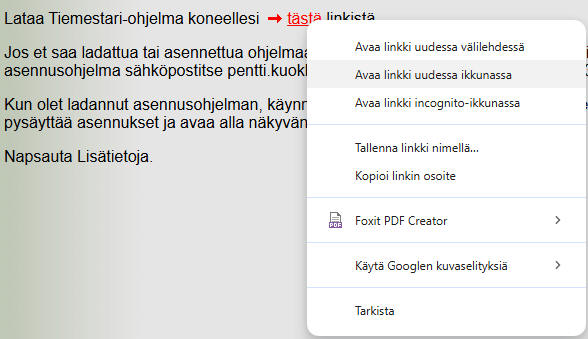 Älä sulje tätä ohjeikkunaa, vaan napsauta edellisellä sivulla olevaa latauslinkkiä. Toiminnon edistyessä katso ohjetta tältä sivulta tapahtuma kerrallaan. Kun käytät Chrome-selainta, niin napsauta edellisen sivun latauslinkkiä hiiren oikealla painikkeella. Valitse sitten avautuvasta valikosta Avaa linkki uudessa ikkunassa.