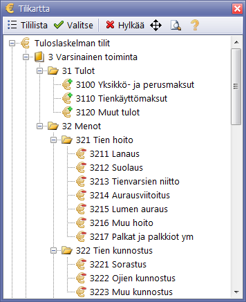 Ohjelmassa on muokattava tilikartta, johon voit lisätä haluamiasi tilejä tai muuttaa siinä jo valmiina olevia. Voit luoda tiliryhmiä, joihin ohjelma laskee summan ryhmään kuuluvista tileistä. Näin voit muodostaa kirjanpitoon kustannuspaikkoja eri tarpeisiin, vaikkapa esimerkiksi tien perusparannusta varten.