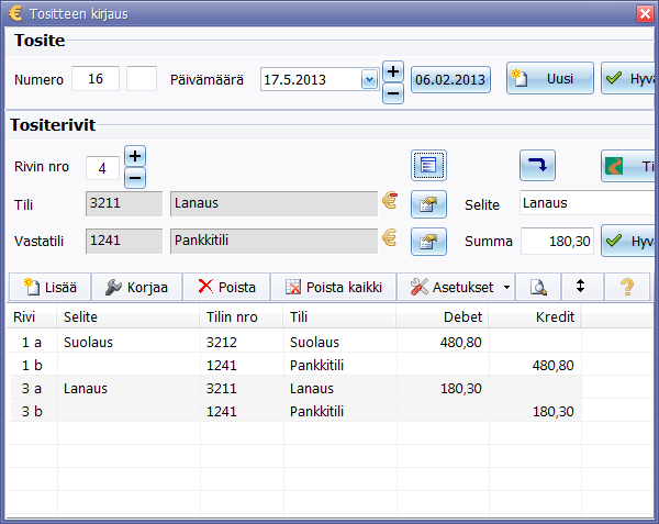 Ohjelma hakee vastatilin automaattisesti (kuvassa pankkitili), luo selitteen tilin nimestä ja päättelee valitun tilin tyypistä debet ja kredit kirjauksen. Tositteiden kirjaaminen on siten yhtä helppoa kuin yhdenkertaisessa kirjanpidossa, eikä kirjaamista voi erehdyksessä tehdä teknisesti väärin.