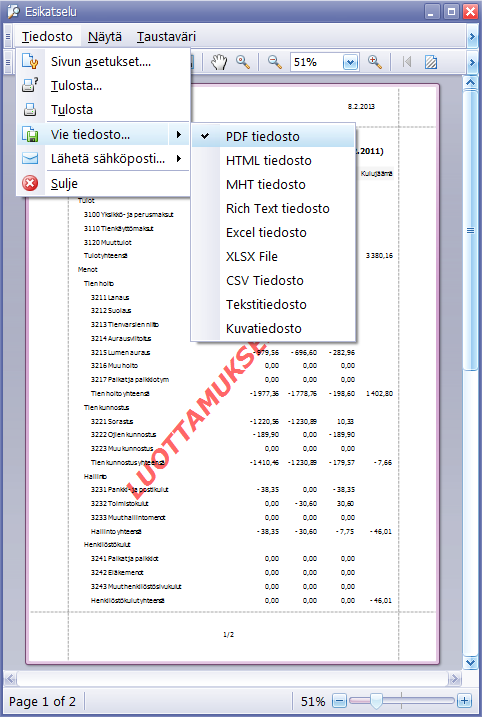 Esikatseluikkunasta voidaan tehdä tulosteen ulkoasuun liittyviä asetuksia (esim. vesileima) ja valita tarvittaessa tiedostomuoto, jossa tuloste halutaan tallentaa.