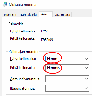 Korjaa lyhyen ja pitkän kellonajan muotoa näppäilemällä niin, että erotinmerkki on kaksoispiste. Hyväksy sitten tämä ikkuna ja kaikki sitä edeltävät ikkunat.