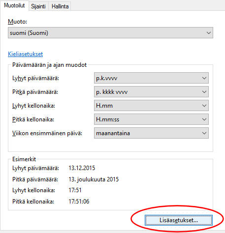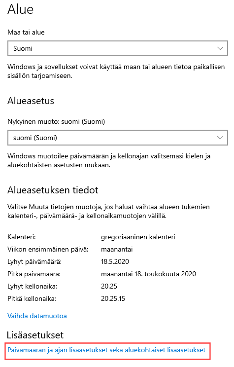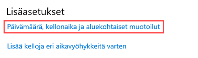 Päivämäärän ja ajan lisäasetukset sekä aluekohtaiset lisäasetukset.